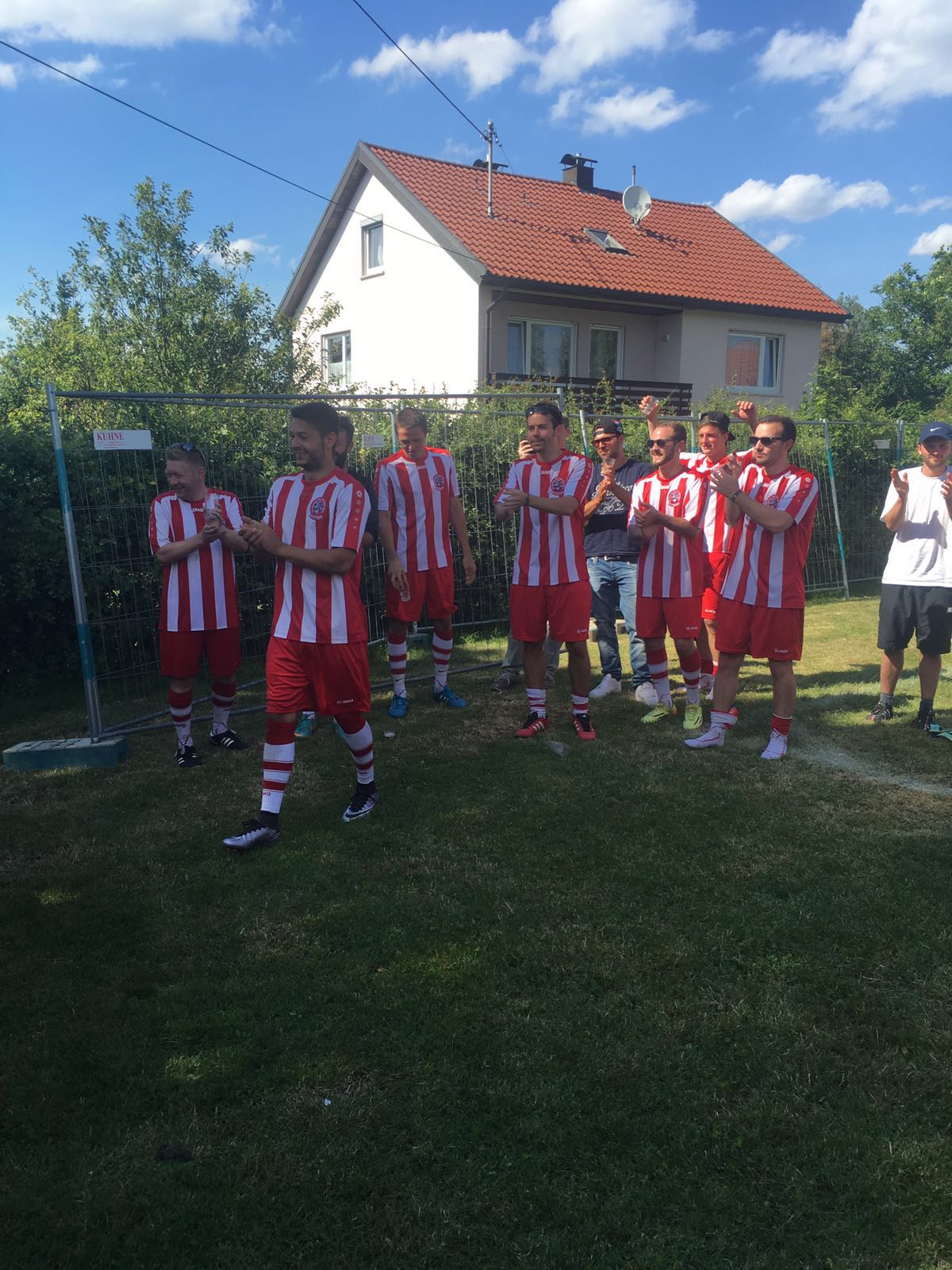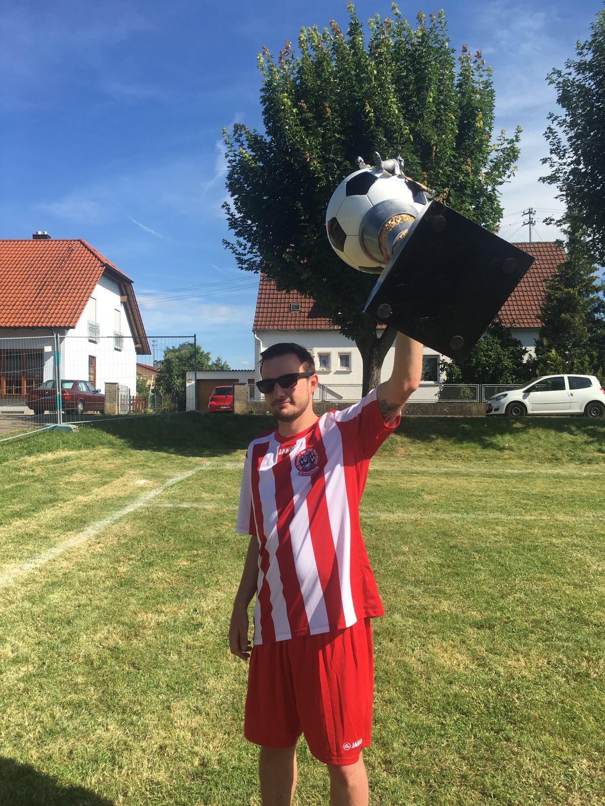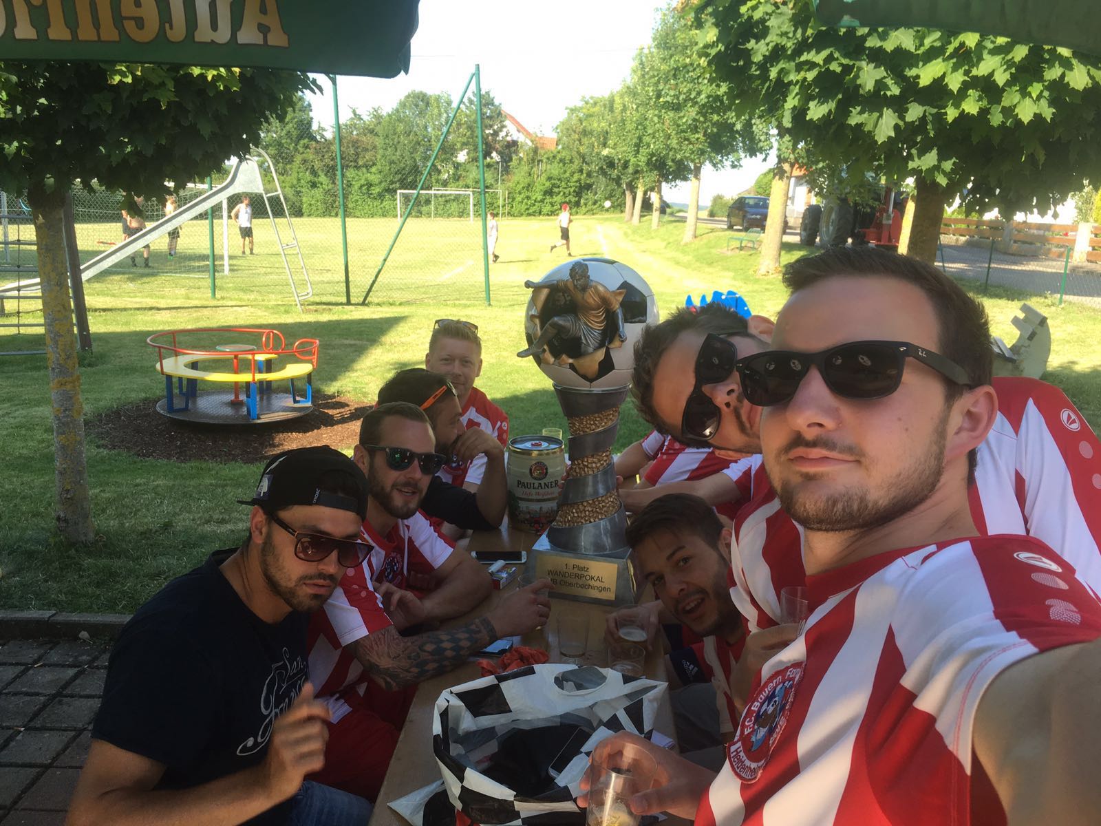Die Stimmung im Bus war schon auf der Hinfahrt gut und man merkte, dass das Team daran glaubte mit dem Pokal nach Hause zu fahren.In Oberbechingen angekommen, streiften die Jungs ihre rot-weißen Trikots über und gingen zu aller erst Richtung Bar um sich dort ausgiebig warm zu machen. Diese Vorbereitung war dann auch die Grundlage zum Auftaktspiel, das die Redstars durch die Treffer von Marcel, Schu, Dome, Marv und Dennis.F mit 7:0 gewannen.Das zweite Spiel hatte man sehr gut im Griff, ließ bis auf 1-2 lange Bälle, bei denen Flo im Tor aber sehr sicher war nichts zu. Leider wollte der Ball aber auch auf der anderen Seite nicht rein und so blieb es beim 0:0. Auch im 3. Spiel stand unsere Verteidigung um Schu, Dennis.S und Dome sensationell und so war es nur eine Frage der Zeit bis irgendwann ein Tor fiel. 5 Minuten vor dem Ende konnte Dennis.F dann aber einen guten Pass von Marcel verwerten und somit gewannen die Redstars dieses Spiel mit 1:0 und wurden somit souveränder Gruppensieger. Auch im Halbfinale gab es keinen Grund zu Sorge, da Flo mal wieder keinen Ball aus dem Netz holen musste, da unsere 3 Jungs hinten drin wie immer sehr souverän agierten und dem Gegner keine Chance ließen. Durch das 5. Tor von Dennis.F und den 2. Treffer von Marvin war auch dieses Spiel gewonnen und es ging ins große Finale.Das Finale gegen die Bachtaler Spezial, die man in der Gruppenphase schon knapp geschlagen hatte, war ein großer Kampf und war bei diesem Wetter sehr kräftezehrend. Leider gelang uns es den Jungs trotz guter Chancen kein Tor zu erzielen, aber auf Dennis.S war Verlass und dank der sehr guten Leistung von Dome und Schu die an seiner Seite hinten nichts durch ließen, blieb es beim 0:0 und es ging bis ins 9-Meter Schießen. In dem dank einer tollen Parade von Flo, Dennis.S den alles entscheidenden 9-Meter auf dem Fuß hatte, bei dem er aber die Nerven behielt und die Redstars damit zum Turniersieg schoß, den sie ausgiebig und mit einigen Kaltgetränken feierten.Trainerteam Manu und Simon waren stolz auf ihre Mannschaft und dann wurde den Jungs für ihre tolle Leistung ohne Gegentor im ganzen Turnier, der Pokal und ein Fass Bier überreicht.Die Redstars werden auch im nächsten Jahr wieder an dem Turnier teilnehmen um ihren Titel zu verteidigen.