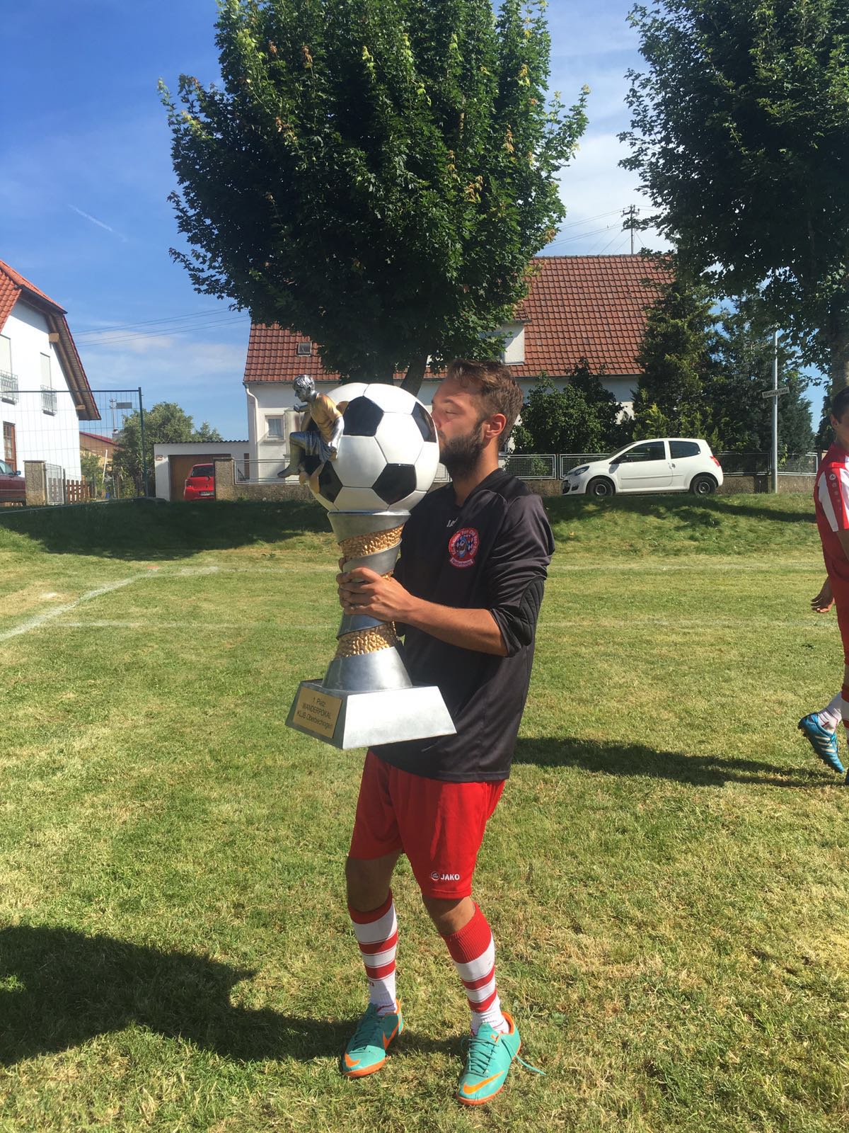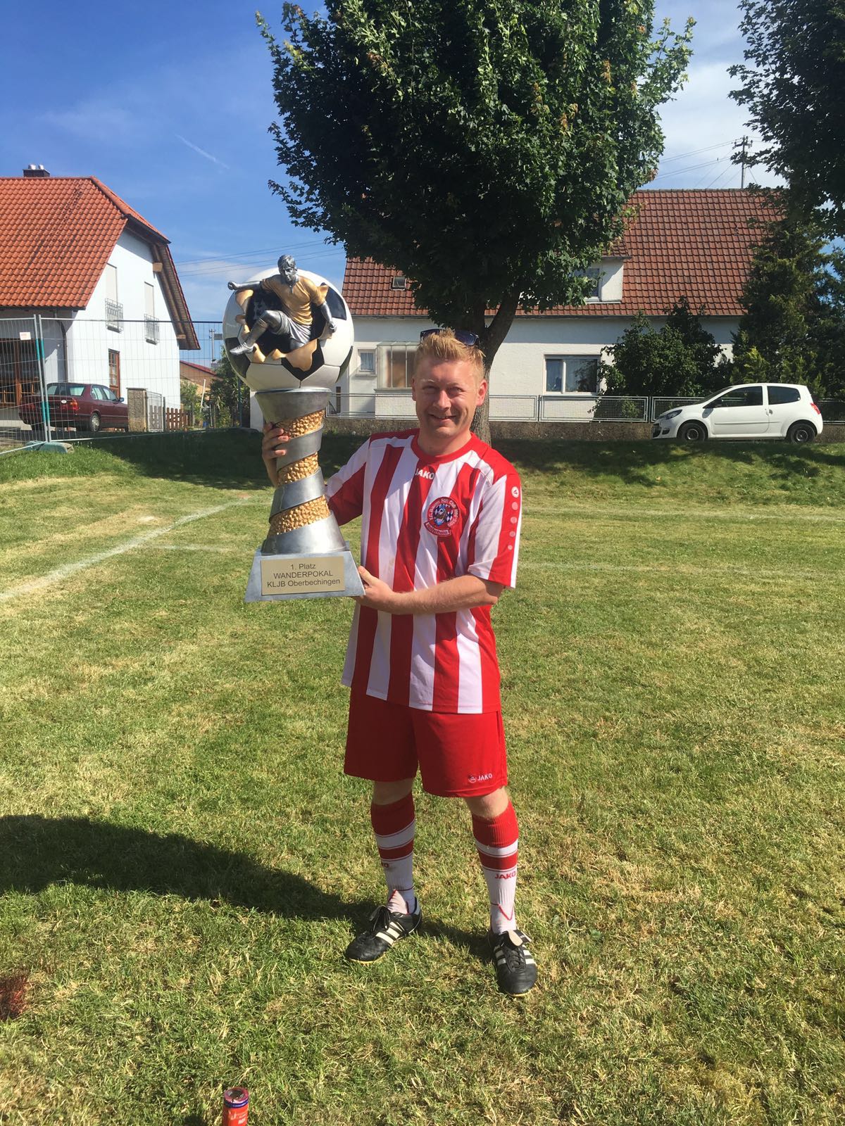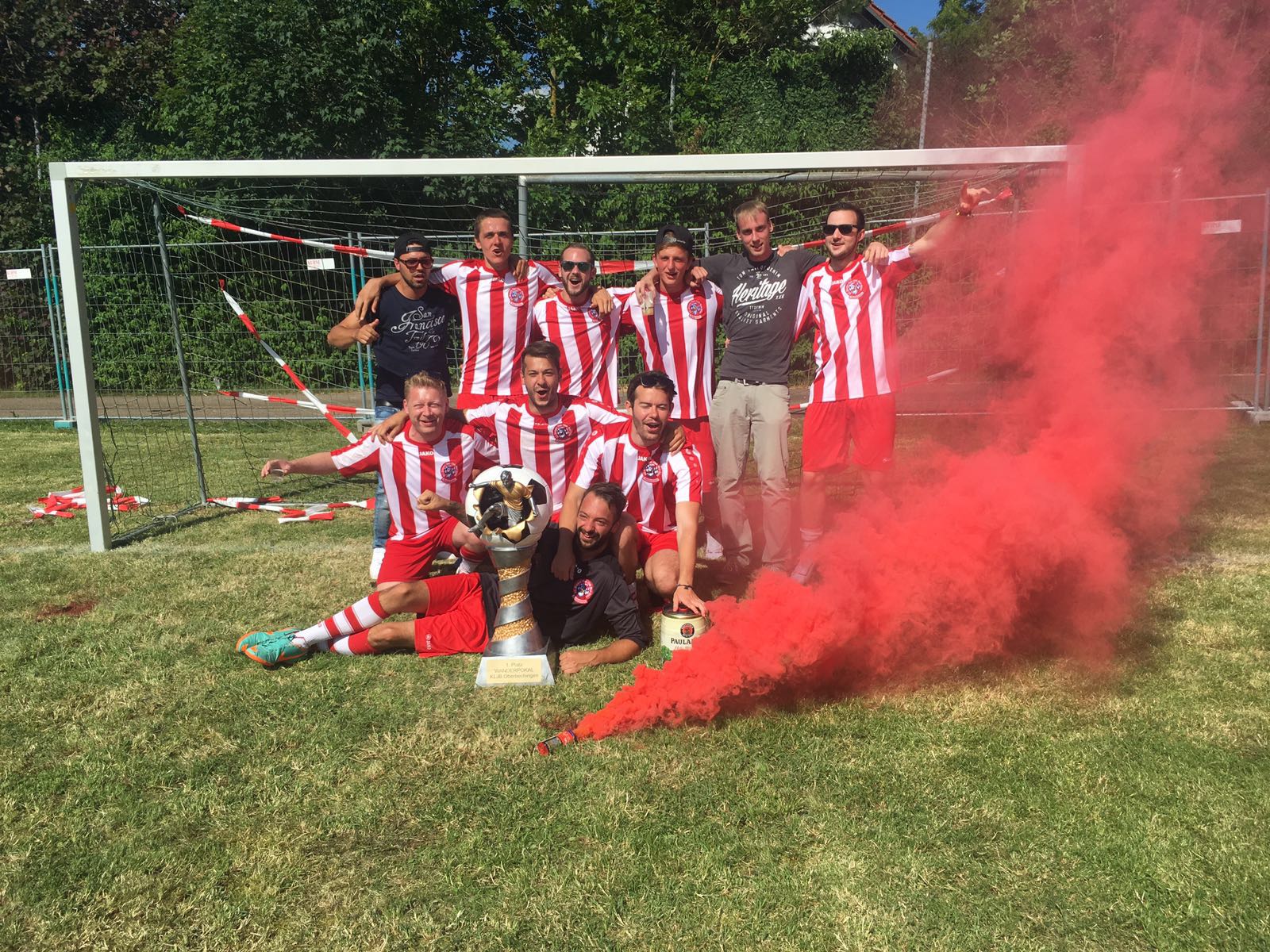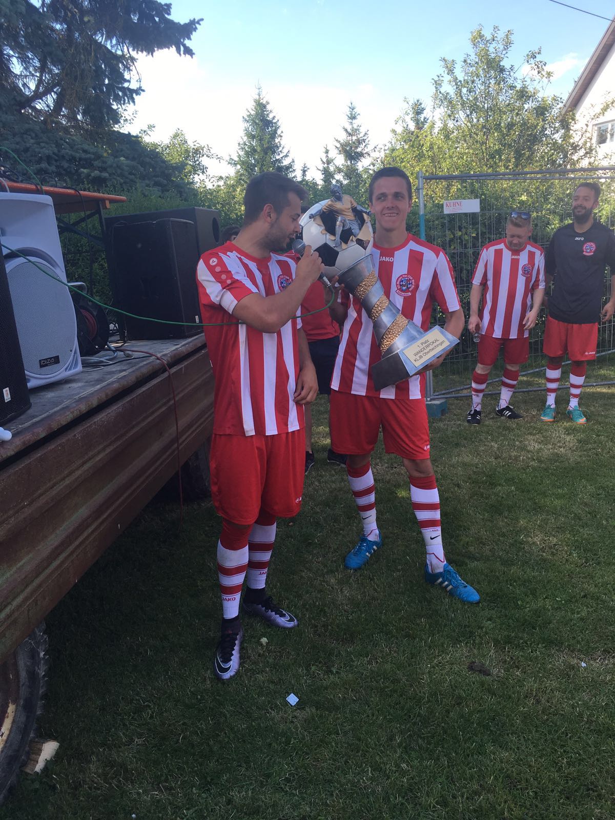 Die Stimmung im Bus war schon auf der Hinfahrt gut und man merkte, dass das Team daran glaubte mit dem Pokal nach Hause zu fahren.In Oberbechingen angekommen, streiften die Jungs ihre rot-weißen Trikots über und gingen zu aller erst Richtung Bar um sich dort ausgiebig warm zu machen. Diese Vorbereitung war dann auch die Grundlage zum Auftaktspiel, das die Redstars durch die Treffer von Marcel, Schu, Dome, Marv und Dennis.F mit 7:0 gewannen.Das zweite Spiel hatte man sehr gut im Griff, ließ bis auf 1-2 lange Bälle, bei denen Flo im Tor aber sehr sicher war nichts zu. Leider wollte der Ball aber auch auf der anderen Seite nicht rein und so blieb es beim 0:0. Auch im 3. Spiel stand unsere Verteidigung um Schu, Dennis.S und Dome sensationell und so war es nur eine Frage der Zeit bis irgendwann ein Tor fiel. 5 Minuten vor dem Ende konnte Dennis.F dann aber einen guten Pass von Marcel verwerten und somit gewannen die Redstars dieses Spiel mit 1:0 und wurden somit souveränder Gruppensieger. Auch im Halbfinale gab es keinen Grund zu Sorge, da Flo mal wieder keinen Ball aus dem Netz holen musste, da unsere 3 Jungs hinten drin wie immer sehr souverän agierten und dem Gegner keine Chance ließen. Durch das 5. Tor von Dennis.F und den 2. Treffer von Marvin war auch dieses Spiel gewonnen und es ging ins große Finale.Das Finale gegen die Bachtaler Spezial, die man in der Gruppenphase schon knapp geschlagen hatte, war ein großer Kampf und war bei diesem Wetter sehr kräftezehrend. Leider gelang uns es den Jungs trotz guter Chancen kein Tor zu erzielen, aber auf Dennis.S war Verlass und dank der sehr guten Leistung von Dome und Schu die an seiner Seite hinten nichts durch ließen, blieb es beim 0:0 und es ging bis ins 9-Meter Schießen. In dem dank einer tollen Parade von Flo, Dennis.S den alles entscheidenden 9-Meter auf dem Fuß hatte, bei dem er aber die Nerven behielt und die Redstars damit zum Turniersieg schoß, den sie ausgiebig und mit einigen Kaltgetränken feierten.Trainerteam Manu und Simon waren stolz auf ihre Mannschaft und dann wurde den Jungs für ihre tolle Leistung ohne Gegentor im ganzen Turnier, der Pokal und ein Fass Bier überreicht.Die Redstars werden auch im nächsten Jahr wieder an dem Turnier teilnehmen um ihren Titel zu verteidigen.