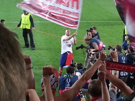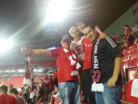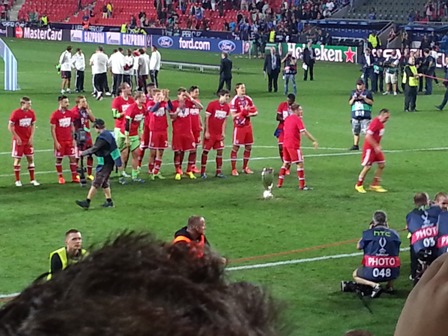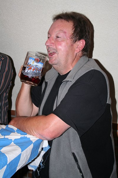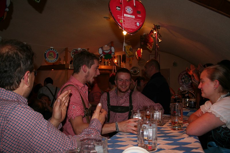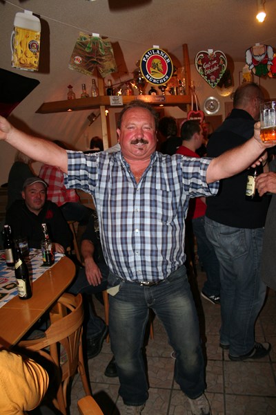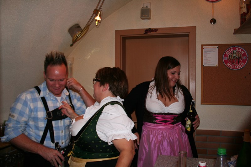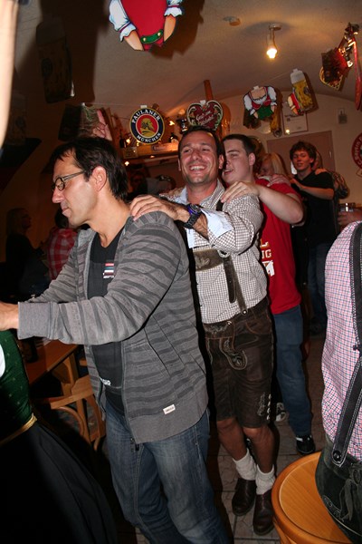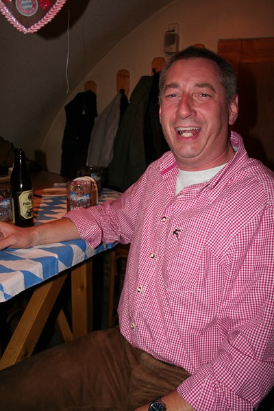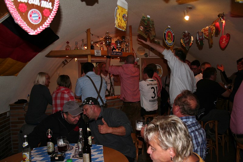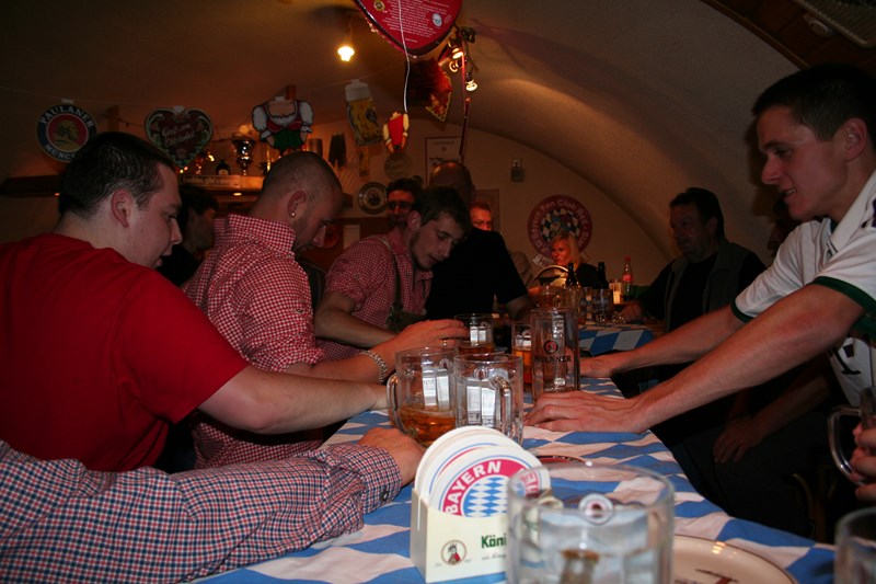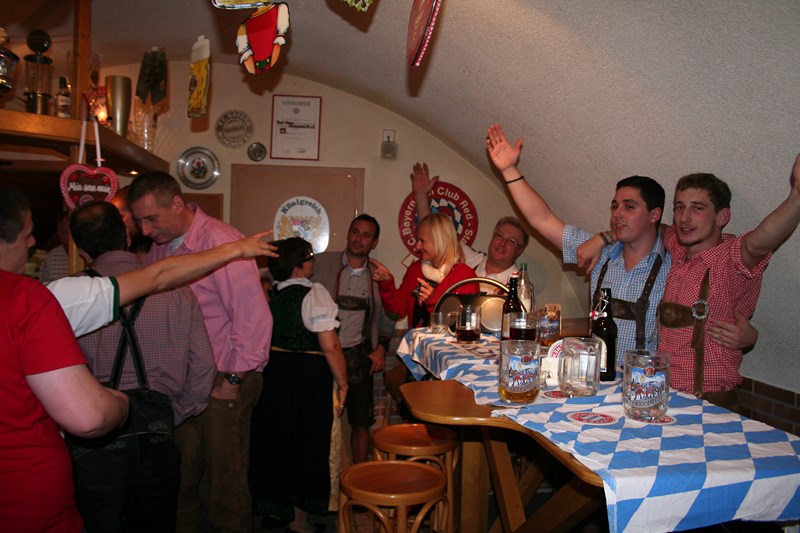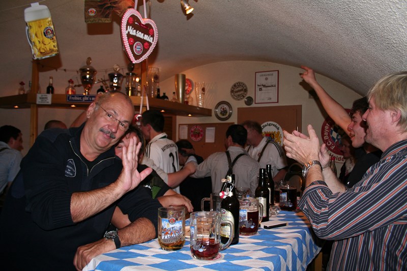 Es galt einen geeigneten Termin für diese in die Taufe gehobene Veranstaltung zu finden. Samstag der 12. Oktober, perfekt es war ja Bundesliga Pause. Die Planung und Organisation bei Jombe in den besten Händen. Daniela und Pierre übernahmen den Hauptpart (bedienen und Musik) an diesem Abend. Vielen Dank!! Weit vor Beginn warteten die ersten vor der Tür um Einlass, einige erschienen dann auch tatsächlich in Tracht oder zeigten ihre Gesinnung als FCB Fan. Schnell war die Stimmung nach oben geschnellt. "Eins zwo gsuffa" ein Prosit folgte dem anderen. Als Metzgermeister Starz (nur das Beste sollte es heute sein) mit seinen leckeren Schweinshaxen mit Knödel und Salat auffuhr kehrte etwas Ruhe ein, eine gute Grundlage wurde geschaffen.