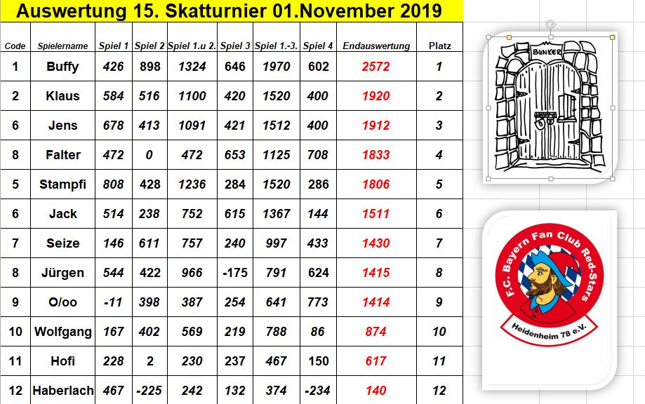 Nachdem zum Turnierbeginn um 16 Uhr alle 12 Teilnehmer anwesend waren, konnte das 15. Skatturnier pünktlich starten.