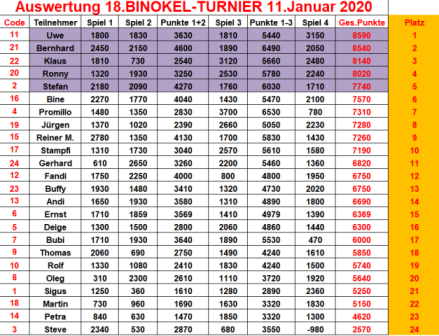 Am Samstag, 11. Januar 2020 traten 24 Weiblein und Männlein an, um bei unserem 18. Binokelturnier die Karten zu mischen. "Uns Uwe" konnte dabei seinen im Vorjahr gewonnenen Titel erfolgreich verteidigen♠?