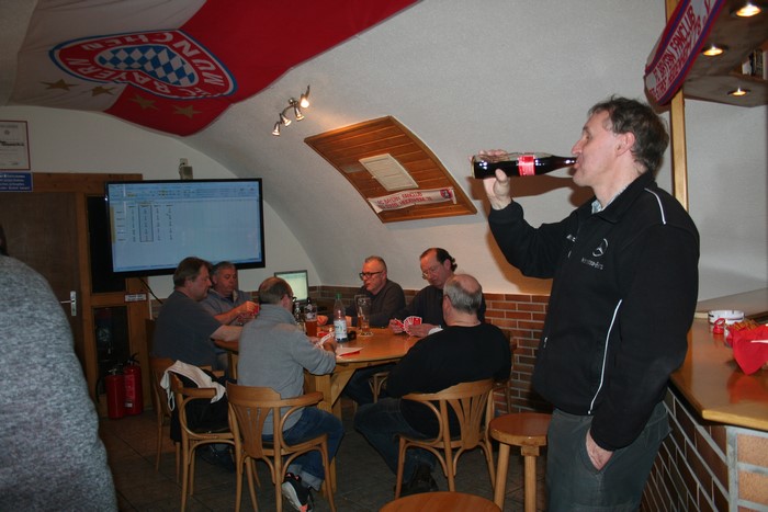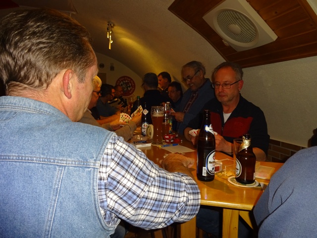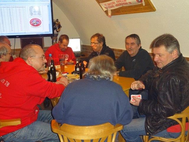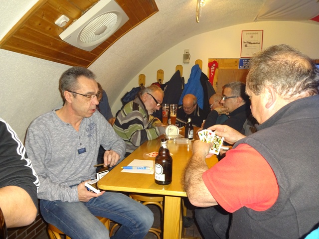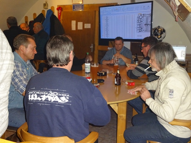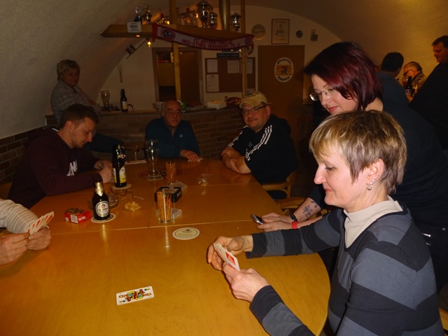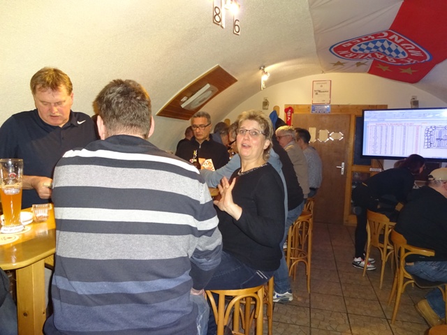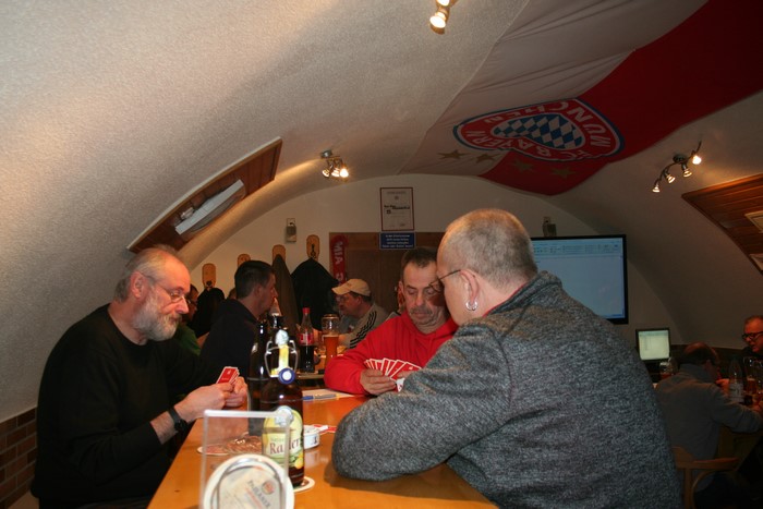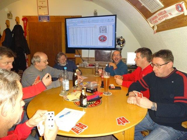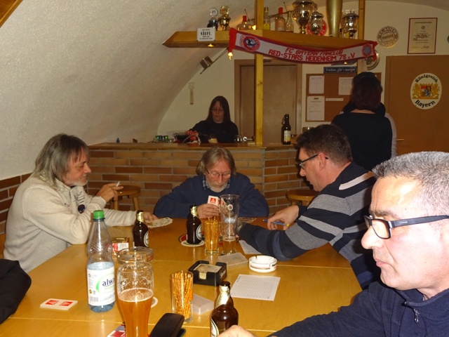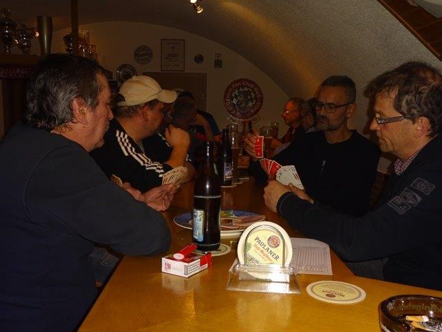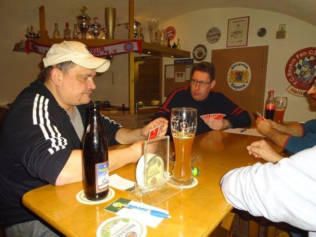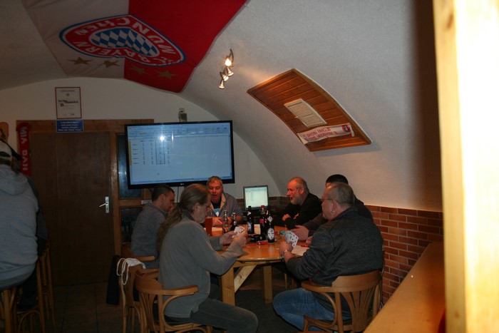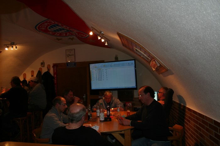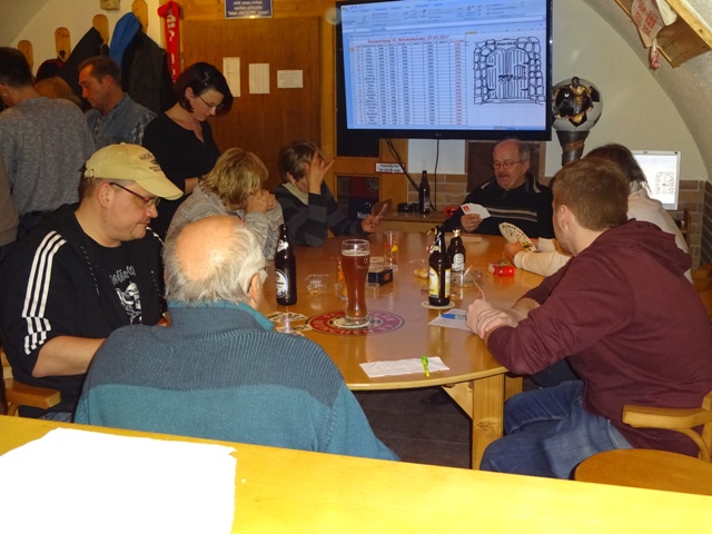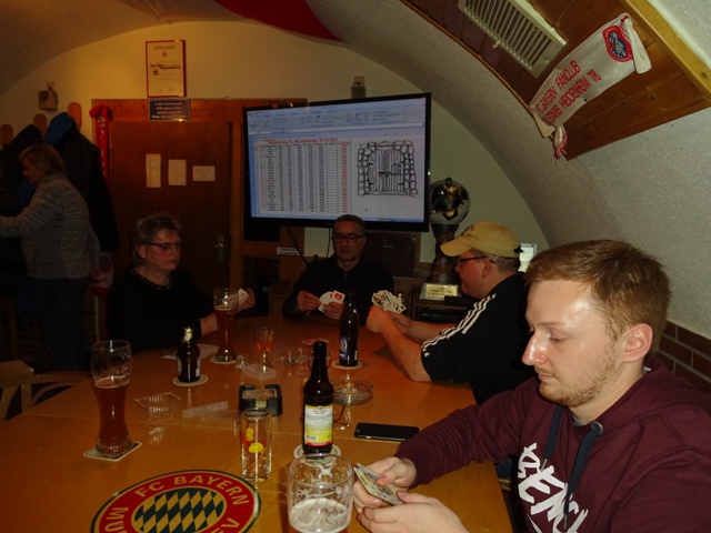 Mal was Neues wenn auch ungewollt. Es kam wie es kommen musste. Eine erste krankheitsbedingte Absage am Morgen, während des Spiels in Berlin eine weitere. Die Hoffnung an 6 Tischen spielen zu können war ad acta gelegt. Schnell noch mal nach Hause, da die Idee wenigstens mit 16 Spielern an 4 Tischen zu spielen, einer passenden Auswertung bedarf. Begrüßung der Anwesenden, ein besonderes Dankeschön an Gabi und Wegga für den Theken - und Küchendienst. Der Vorschlag an 4 Tischen a 4 Spieler erhielt den Vorzug. Jack verzichtete großzügigerweise auf eine Teilnahme, Respekt! 240 Spiele in 3 Runden bei bester Versorgung in einer sehr angenehmen Turnieratmosphäre, sorgten bis zum Schluss für echte Spannung. Promi sicherte sich einen guten 4. Platz, Erwin belegte gleich bei seiner ersten Teilnahme einen Platz auf dem Podest, Joschi der Vollblutkartenspieler wurde 2. Der als Ersatz eingeplante Fandi sicherte sich seinen ersten Turniersieg mit 1643 Punkten. PS: Die Auswertung der Spiele wurde komplett überprüft und überarbeitet.