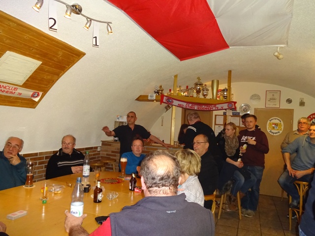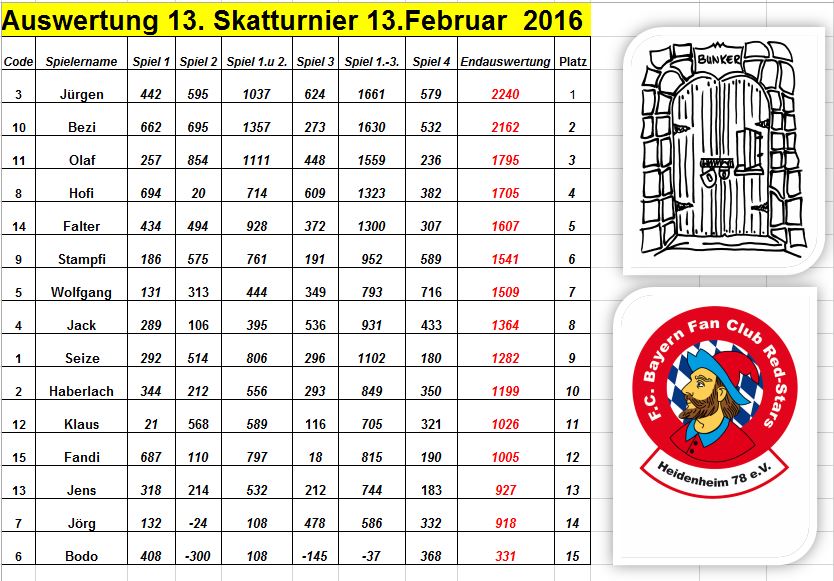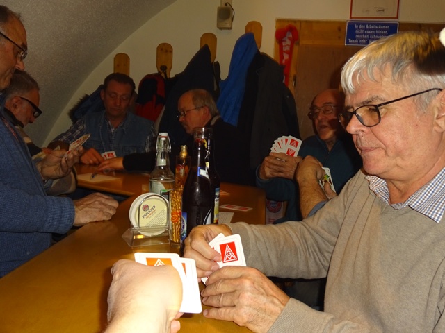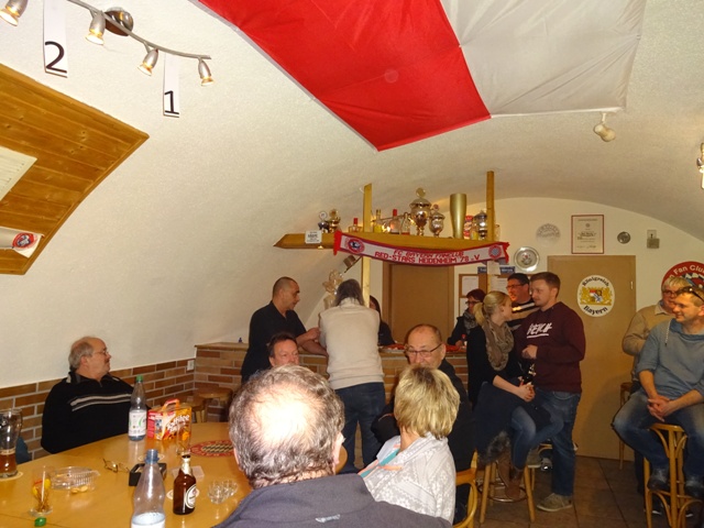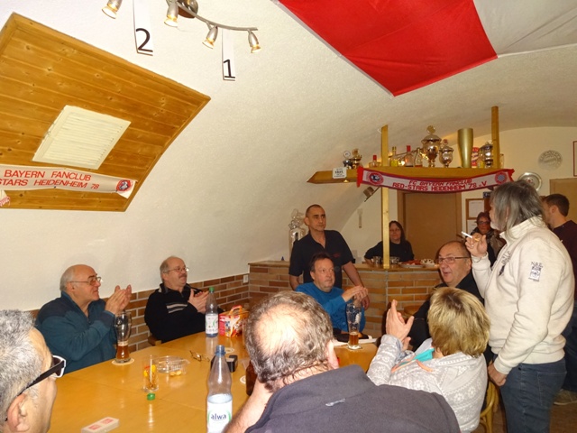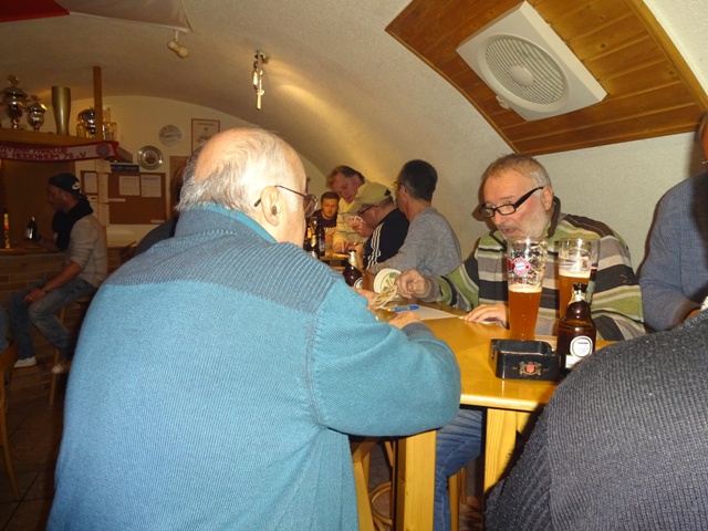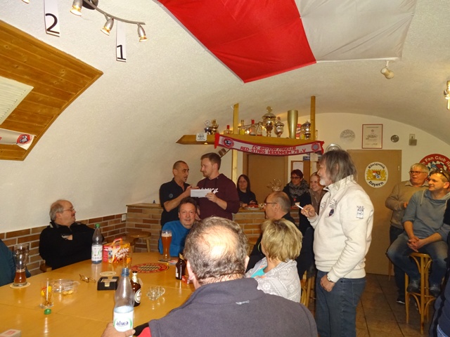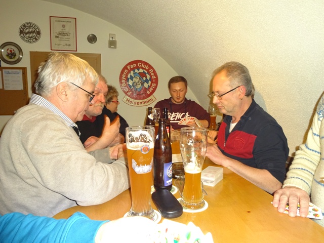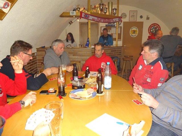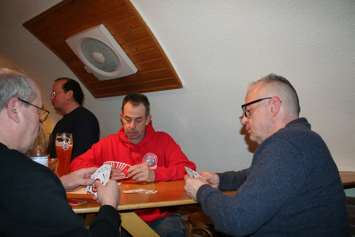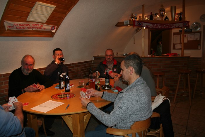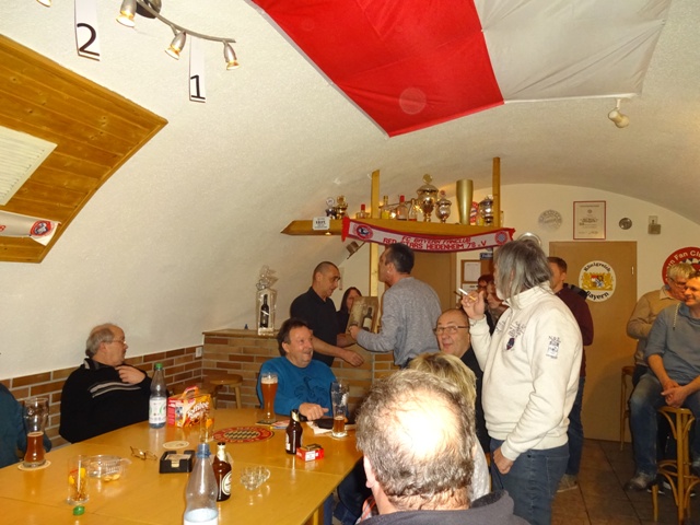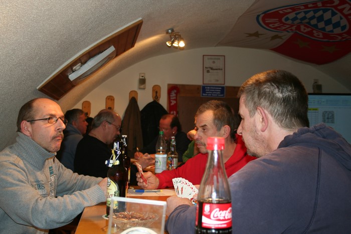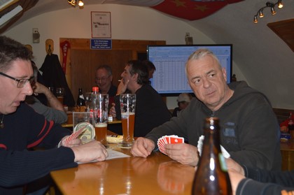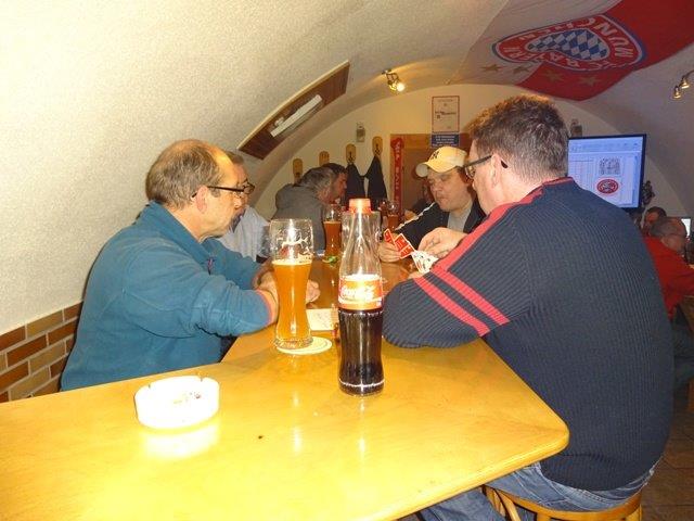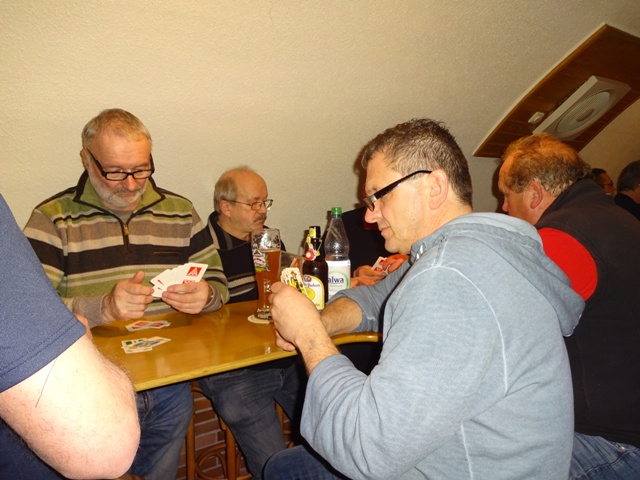 Mal was Neues wenn auch ungewollt. Es kam wie es kommen musste. Eine erste krankheitsbedingte Absage am Morgen, während des Spiels in Berlin eine weitere. Die Hoffnung an 6 Tischen spielen zu können war ad acta gelegt. Schnell noch mal nach Hause, da die Idee wenigstens mit 16 Spielern an 4 Tischen zu spielen, einer passenden Auswertung bedarf. Begrüßung der Anwesenden, ein besonderes Dankeschön an Gabi und Wegga für den Theken - und Küchendienst. Der Vorschlag an 4 Tischen a 4 Spieler erhielt den Vorzug. Jack verzichtete großzügigerweise auf eine Teilnahme, Respekt! 240 Spiele in 3 Runden bei bester Versorgung in einer sehr angenehmen Turnieratmosphäre, sorgten bis zum Schluss für echte Spannung. Promi sicherte sich einen guten 4. Platz, Erwin belegte gleich bei seiner ersten Teilnahme einen Platz auf dem Podest, Joschi der Vollblutkartenspieler wurde 2. Der als Ersatz eingeplante Fandi sicherte sich seinen ersten Turniersieg mit 1643 Punkten. PS: Die Auswertung der Spiele wurde komplett überprüft und überarbeitet.