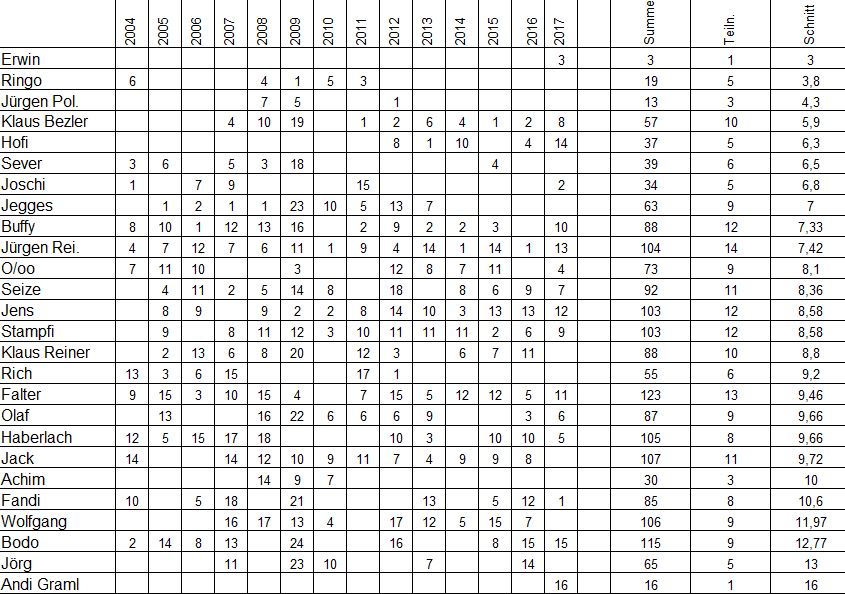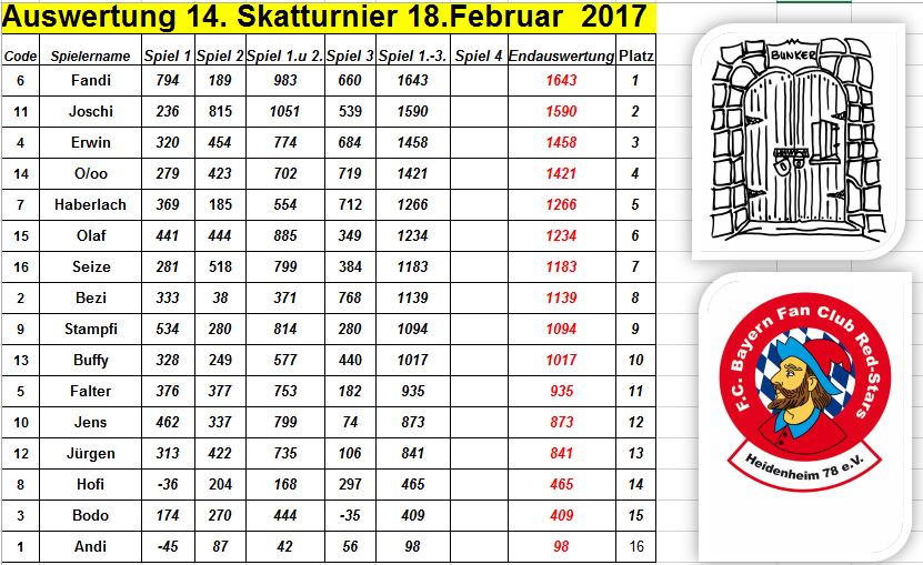 Ewige Tabelle aller gespielten 14. Skat Turniere